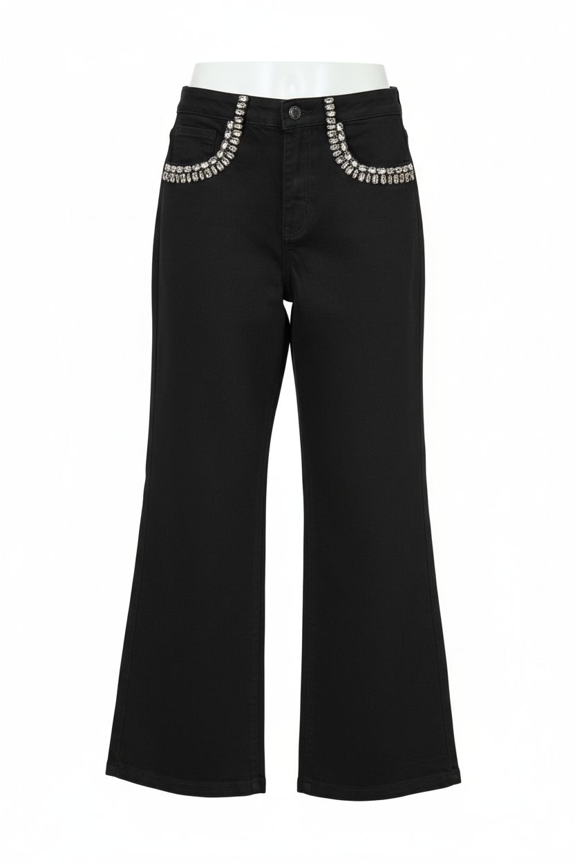 Calças pretas elegantes com detalhes em cristais nos bolsos, perfeitas para criar um look sofisticado e glamoroso. O corte largo e fluido proporciona conforto e estilo, enquanto os cristais adicionam um toque luxuoso e brilhante.